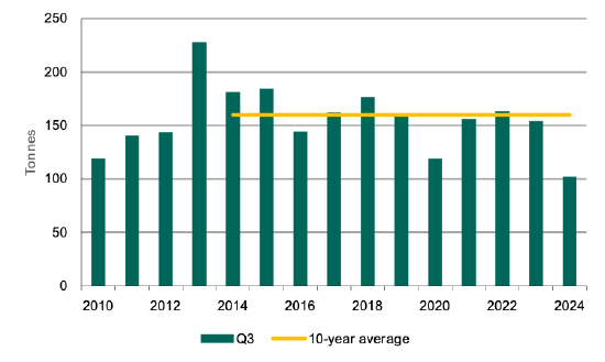 但有业内人士指出,其金饰销量仍远低于往年的水平。我们的数据显示,2024年三季度的销量创下自2010年(119吨)以来同期新低,低于十年均值36%(图2)。此番需求的疲软态势主要由于人民币金价持续高位、消费者信心匮乏以及经济增长放缓,与二季度的情况基本相仿。