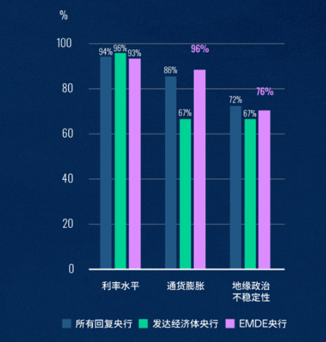 今年,分别有96% 和 76% 的新兴市场和发展中经济体央行认为“通胀担忧”和“地缘政治不稳定性”是影响储备管理决策的重要因素,而发达经济体央行中只有67% 这样认为。
