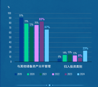 在调查对象中67%的人将黄金与其他储备资产分开管理与去年的83%相比有所下降将黄金作为投资资产管理的受访者比例,也相应增加从去年的8%增至今年的 23%。