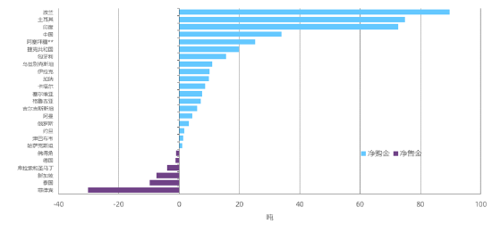11月全球央行净购买量53吨,各国央行通过国际货币基金组织(IMF)和其他公开数据来源报告显示: