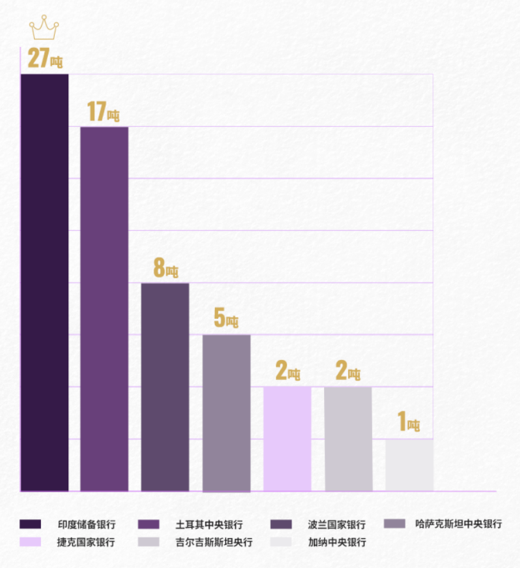 11月,放眼到全球范围,还有家中央银行增加1吨及以上的黄金(从左到右分别是)
