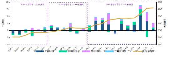 11月流入约32亿美元。中国市场再次领跑,流入达22亿美元。股市疲软、金价反弹以及地缘政治紧张局势,共同推高中国及日本市场对黄金ETF的投资需求。中国近期宣布黄金市场增值税政策的调整,可能进一步刺激了基金流入