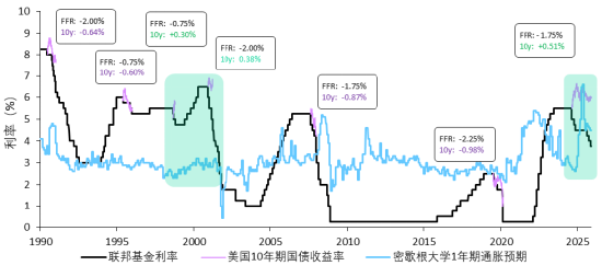 *数据截至2025年12月31日。方框显示了从降息周期开始到联邦基金利率(FFR)至少累计降息175个基点期间(在达到该降息幅度的周期中),FFR和10年期国债收益率的变化(以百分点计)。若降息周期较为温和,则显示FFR的最大降幅。