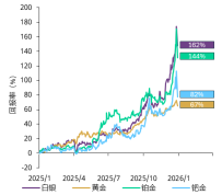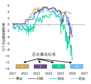 12 月贵金属大涨但走势分化:白银铂金的变动显示出政策驱动型特征,黄金温和上行,贵金属价格“雷鸣”般的全线飙升,推动该板块实现了45年来未见的同比回报水平。此轮涨势的最后一波冲高,尤其是黄金以外的贵金属,更多是受到政策面与短期市场供应收紧的影响。