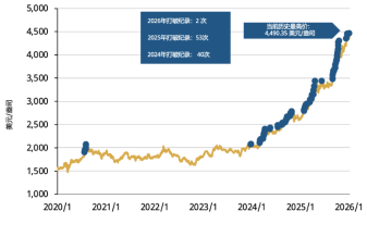 2026年刚刚开局,在各类风险和不确定性的影响下,金价强势依旧,创下5次新高(截止于1月14日)。