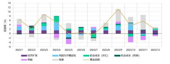 *数据截至2025年12月31日。我们的短期金价表现归因模型(GRAM)是有关金价月度回报的多元回归模型,其中包括四类关键的金价表现驱动因素:经济扩张、风险与不确定性、机会成本和趋势动能,这些驱动因素的相关主题反映了黄金需求背后的动机,更为重要的是投资需求背后的动机。这些被认为是短期内黄金价格回报的边际驱动因素。“残差”包含了目前模型尚未捕捉到的其他因素。此处结果是基于五年期月度数据的分析。其他估算周期和数据频率选项可在 Goldhub.com 获取。