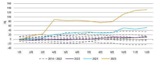 得益于创纪录的基金流入及金价上涨,2025年底,中国市场黄金ETF资产管理总规模(AUM)升至2,420亿元人民币,全年涨幅达243%,同期总持仓亦增长超116%至248吨,两项数据均创历史新高。