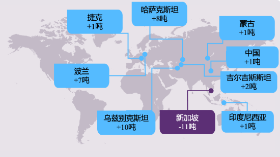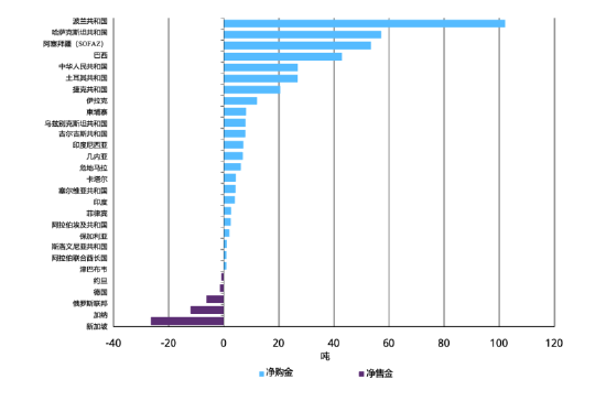 其他主要官方买家包括:哈萨克斯坦(57吨)、阿塞拜疆(53吨)、巴西(43吨)、中国(27吨)和土耳其(27吨)。