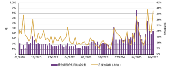 1月,上海期货交易所的黄金期货日均交易量达456吨,金价波动性走高及金价的强劲涨势,吸引了更多市场关注,推动黄金期货交易量环比增长17%,较其五年均值高出 72%。