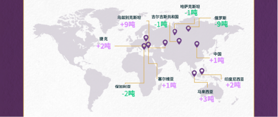俄罗斯央行成为当月最大官方黄金净卖家(9吨),其次是保加利亚国家银行(2吨)。哈萨克斯坦和吉尔吉斯斯坦央行分别减持黄金1吨。