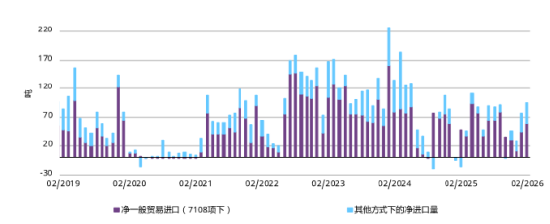 根据中国海关最新数据,2026年初中国黄金进口量有所回升,1月净进口量达77吨,与去年同期净出口6吨相比大幅增加。2月黄金净进口量达96吨,同比增加63吨。