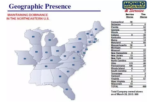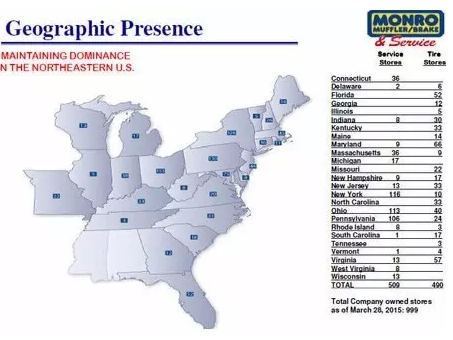 截止于2015年7月公司拥有25个州999个店(其中纽约、俄亥俄、宾法三州加起来有400+),另外在2015年4月的收购Car-X使得公司有另外拥有10个州的146家加盟店。