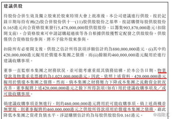 这种大比例合股,然后高折价、大比例供股的做法,基本就是如假包换的出老千玩法,合股及供股比例之大在老千界也并不多见。并且从公告及公司董事口吻可以得知,公司通过供股来向股东钱,明面上是为了业务发展的需要,多半用于收购资产,但实质上更可能的是,目前公司日子可能并不好难过,只好向股东要钱还旧债度日。