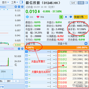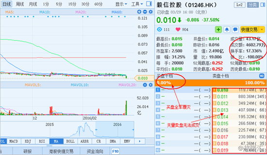 29日,港股市场再现奇葩!毅信控股(01246.HK)开盘后出现暴跌,直接跌到了0.01港元/股,跌幅37.5%。