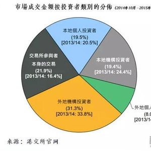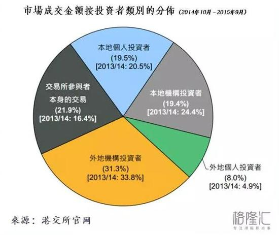 从上图可以最直观的看出,2015年,外地机构大概占了总成交金额的31.3%,本地机构占了19.4%,加上交易所参与者本身的交易21.9%,港股市场机构总共占了7成,剩下的三成则主要是本地的散户(2成)和外地的散户(1成),所以说港股是机构的天下是有道理的。