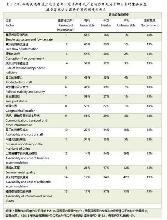 按照被访问公司认为重要的次序,列出了15项他们选择在香港开设地区总部、地区办事处或本地办事处的主要因素和他们的看法。