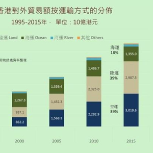瞬间二十年,东莞打个喷嚏全世界就感冒的时代已一去不返。珠三角与香港这个曾经的世界第一大集装箱港之间的集装箱量只占目前该港口总吞吐量的四成。葵青港已经成了为班轮公司服务的中转服务港,中转量已达七成。从贸易额角度看,会发现,对香港而言,更重要的是空港。下图显示,香港商品对外贸易总额的四成是航空运输完成的,海运河运加起来才占两成。我分析过的更详细的数据显示,陆运与空运高度相关,而不是海运。也就是说,香港经济四大经济支柱行业中的两个,物流与贸易,越来越多地以提供高货值最终消费品相关服务为生。因此,我一直强调,香港赤腊角国际机场是香港经济的咽喉。