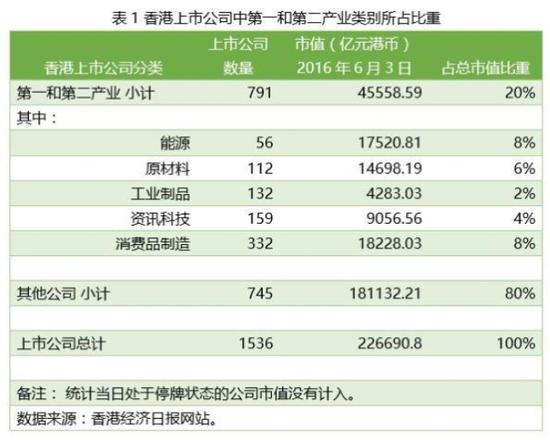 无独有偶,我们看到,近年来越来越多香港的上市公司不是属于制造业,而是各种其他消费行业和服务行业。也就是说,作为香港最主要支柱的金融服务业,其直接服务的对象,也主要不是生产制造业(见表1)。这些数据和前面提到的贸易与运输的数据一起说明,香港已从一个主要服务于生产网络的枢纽变成了全球消费网络上的枢纽。