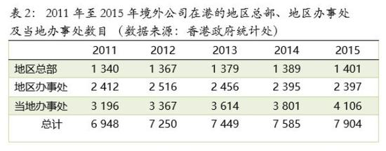 我们先看香港是如何支撑跨国企业全球化发展的。2015年,香港境外母公司在香港设立的地区总部、地区办事处及当地办事处一共7904个(见表2),雇佣员工42万多人。这是一个庞大的所谓总部经济。香港政府对此相当重视,每年都针对这些公司做问卷调查。调查除了关注这些公司的主要活动内容,服务对象,更是收集他们对香港看法的一个重要途径。