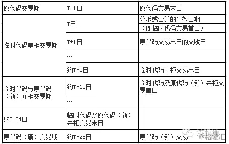 第三阶段:在上一阶段开始至少15个交易日后,并行买卖将会结束,临时代码停止交易。分拆或合并后的股份通过原代码(新)以新的每手买卖单位进行交易。