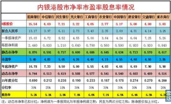 6、净资产是最强大的护城河。扣除分红后按照目前的股价,交通银行H股年底动态市净率为0.489倍;光大银行为0.508倍,中信银行为0.513倍,重庆农村商业银行为0.516倍,中国银行为0.54倍,农业银行为0.541倍。从市盈率角度看,重庆农村商业银行3.86倍,农业银行4.19倍,光大银行4.26倍,工商银行4.40倍,交通银行4.50倍,中国银行4.55倍,建设银行4.68倍,中信银行4.85倍。