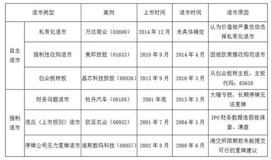 “自主退市”包括:私有化、强制性收购、创业板转板,及撤回上市地位等;“强制退市”则包括:公司财务或业务状况不再满足上市要求,严重违反《上市规则》或影响市场公平秩序,及停牌公司无足够措施推动复牌等。