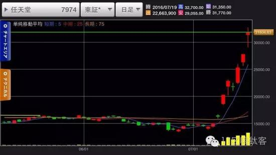 7月11日,星期一,东京证券交易所一开盘,任天堂的股票就飙升到涨停。到目前为止股价走势是酱婶儿的(从14000到31000,涨幅120%)
