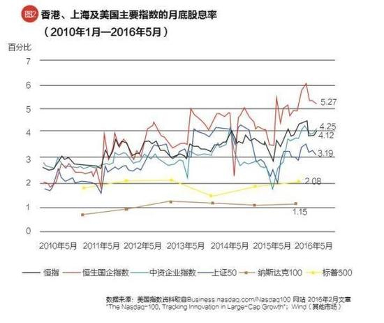 事实上,过去五六年间的大部分时候,上证50指数的股息率均较恒指低,而自2011年起,恒生国企指数的股息率大部分时候均高于其他香港指数及上证50的股息率。相较之下,纳斯达克100的市盈率虽相对较高,其股息率却是最低。