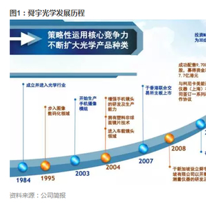 舜宇光学目前主要有三大块业务,光电产品、光学零件和光学仪器。2016年上半年数据显示,舜宇光学摄像头模组的出货量占全球市场份额的8.9%,居全球第一的位置;摄像头镜头的市场份额为9.4%,居全球第二位;车载镜头于2004年就已布局,目前是全球最大的供应商,占全球市场份额的25%-30%。舜宇光学发展历程如下: