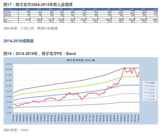 2009-2015年,受益于全球智能手机的高速渗透,手机摄像头像素快速迭代,2017年舜宇光学的收入达到了106.97亿元人民币,2004-2015年,舜宇光学收入规模扩大了34.7倍,年复合增长率为34%。
