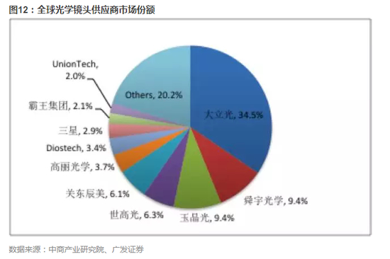 相比摄像头模组的市场分布,全球光学镜头供应集中度相对较高,2015年前5大厂商的市场份额就占到了65.7%,台湾厂商大立光独占鳌头拥有34.5%的市场份额,舜宇光学紧跟大立光的步伐,市占率达9.4%。
