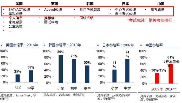 教培行业的市场空间取决于升学考核制度中“考试成绩”的比重,入学考试是市场的指挥棒。在东南亚国家,尤其是中、日、韩,由于考试成绩占比较高,加上历史文化上的因素,衍生出了教育培训这一特殊的行业。