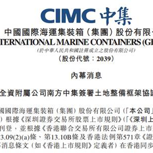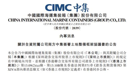 10月9日傍晚,中集集团发布公告,集团全资子公司南方中集与深圳规土委、前海管理局,针对中集位于前海的三块宗地的土地整备问题,签署了《土地整备框架协议书》。