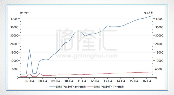 从下图可以深圳市看到商业用途和工业用途的地块平均地价的差距,而这样的差距仍在扩大,现在商业用地大概在43000元/平方米,而工业用地只有个零头,4000元/平方面,工转商就会把中间的价值得到释放,这期间就会有政府和企业之间的博弈,而协议则是博弈的结果。