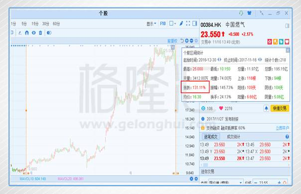 今年以来燃气股在香港市场的表现确实大放异彩,截至11月16日,燃气股“三架马车”:中国燃气涨幅超130%,新贵中裕燃气涨幅为125%,新奥能源涨幅为89%。一改以往投资者对公用事业稳健或沉闷的印象,发现原来防御性股票,原来其进攻性“暴虐”起来的时候真的一点都不差。