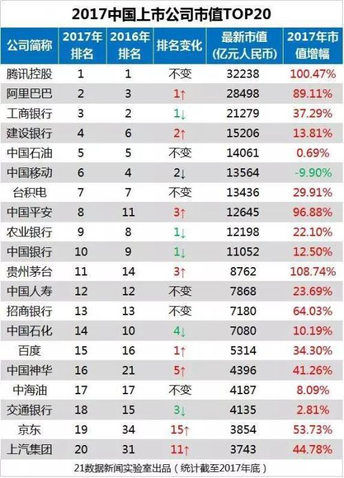 2018年第一天,中国上市公司市值排名出炉。
