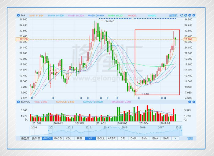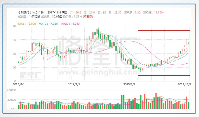 把永利澳门的股价走势拉长,2014年澳门博彩行业进入寒冬,永利澳门股价不仅腰斩,都斩到脚踝了。到了2016年博彩业开始整体复苏,从2月份开始,永利澳门的股价便一路向上,到今天为止,涨了2.8倍,跑赢余下的几家豪赌股,可以说是这一波复苏的大赢家。