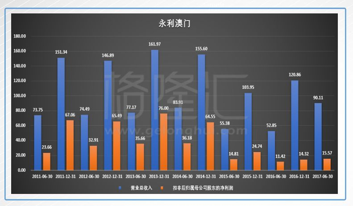 2017年全年,集团实现总收益为153.56亿港元,同比增长3.01%;其中娱乐场收益为151亿港元,同比增长3.06%。