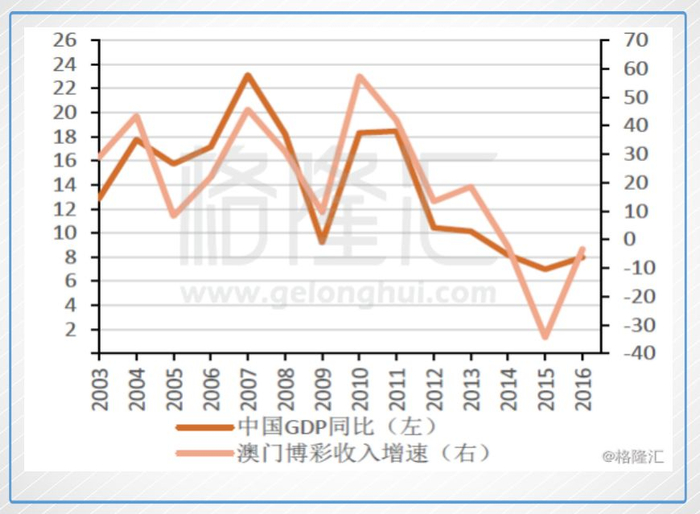 下图是中国GDP增速和澳门博彩收入增速的图,可以看到它们的波动幅度是一致的,除了2014、2015年来自国家的有形的手干扰了一下(如反腐、银联卡限制、出入境限制等),波动幅度稍微有所偏颇。
