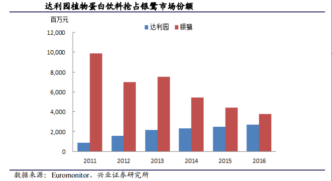 2017年财年中,在豆本豆的带领下,植物蛋白和含乳饮料收入为21.92亿人民币,同比增长32.9%,在豆本豆推出之前,2016年达利食品那块植物蛋白和含乳业务那块已经下滑16.1%。