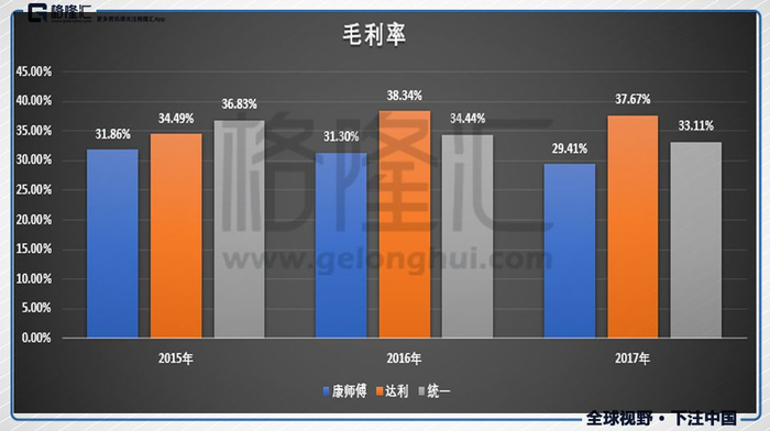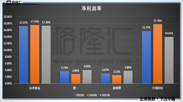 近几年,像统一、康师傅、旺旺都面临着增长停滞的问题,而达利却能一枝独秀,保持每年稳定增长。并且净利润一直保持高于行业平均水平,就拿2017年拿说,净利润率为17.53%,而同行业的康师傅、统一分别只有3.8%和4.06%。