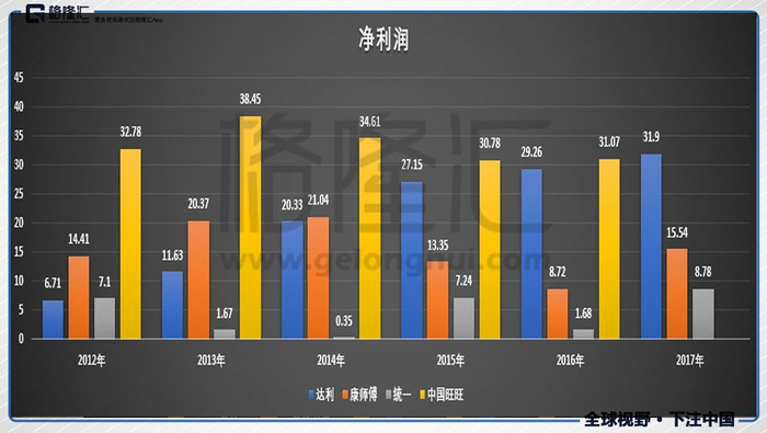 净利润方面,从2012年的最弱,一步步增长,并且增速飞快,在2013年时候反超统一,2015年再超康师傅,2016年的时候已经接近中国旺旺了;并且,近几年来,旺旺、统一以及康师傅的净利润都有呈现逐年下滑的趋势,唯独达利是稳步提升的。