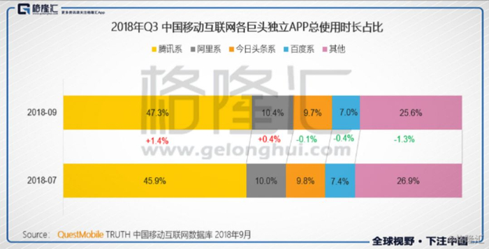 据Questmobile,2018年9月,头条系app的总使用时长占总用户时长9.7%,仅次于腾讯和阿里。而在2017年7月,腾讯系的占比高为54%,目前仅为47%。从数据上看,头条系并未四处点火,头条系挤占的用户时长,几乎就是硬生生从腾讯一家切过来的。