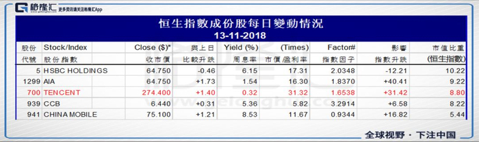 但截止11月13日,腾讯占恒生指数的比重为8.8%,在全部成分股中已滑落到老三,排在前面的是友邦保险和汇丰控股。