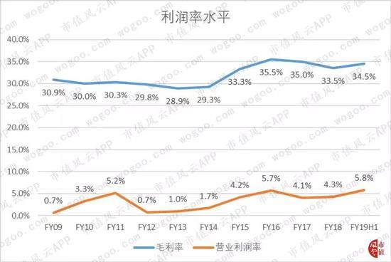再来看看公司的利润率水平。2016-18年间的毛利率分别为35.5%、35%和33.5%,呈现下滑态势,2019年上半年回升至34.5%。公司表示,2019年上半年毛利率的提升主要是因为向客户销售商品时提供的折扣减少所致。