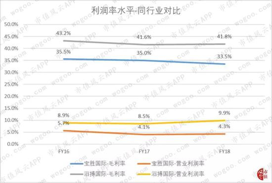从利润率角度来看,宝胜国际跟老大哥之间也有差距。2016-18期间,滔搏国际的毛利率为43.2%、41.6%和41.8%,同期宝胜国际的毛利率为35.5%、35%和33.5%。