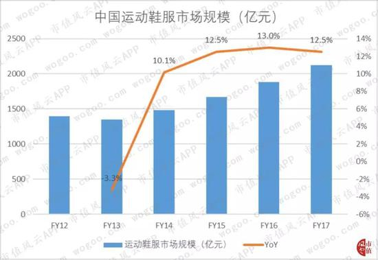 有需求,就会有消费,受益于全民运动热,虽然社会消费品零售总额的增速近几年持续下滑,但是运动鞋服市场却实现了稳定增长。2017年,中国运动鞋服市场规模达到2121亿元,同比增长12.5%,2015-17年间市场规模增速基本保持稳定。