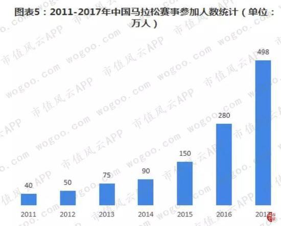 在如此密集的马拉松赛事安排的背后,参赛人数也在稳步增长。根据统计,2017年中国马拉松参赛人数达到498万人,2011年仅有40万人,翻了10倍。