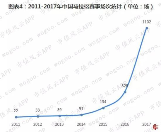 据统计2017年中国大大小小的马拉松赛事达到1102场,平均每天举办三场赛事,而2016年才只有328场,2017年翻了三倍还有多。
