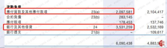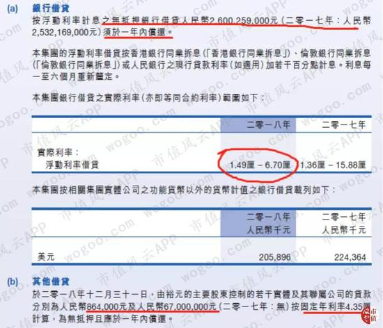 应付账款之前已经分析过这里就不做过多解释,我们来看看银行及其他借贷的构成。在总计35.3亿元的银行及其他借贷中,须在一年内偿还的约26亿元,借款利率在1.49%至6.7%之间浮动,借款利率中位数为4.1%,相对较低。